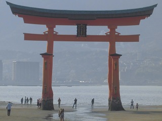 海に浮かぶ神の島宮島を守る朱塗りの大鳥居。