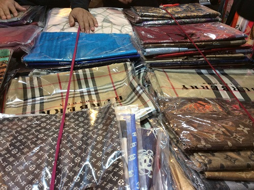 お正月を祝う、派手な飾り付けや関連グッズが目を引きます。