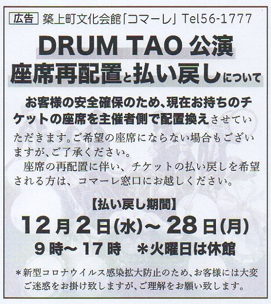 - 築上町文化会館コマーレ「DRUM TAO」公演座席再配置と払い戻しについて