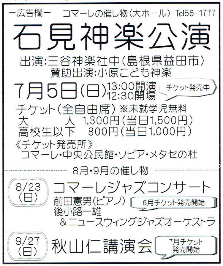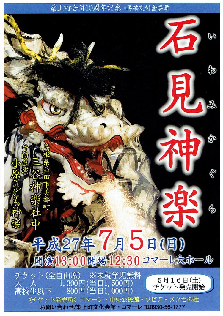 平成27年7月5日(日)、築上町文化会館コマーレにて、築上町合併10周年記念・再編交付金事業して「石見神楽(いわみかぐら)」が催されます。