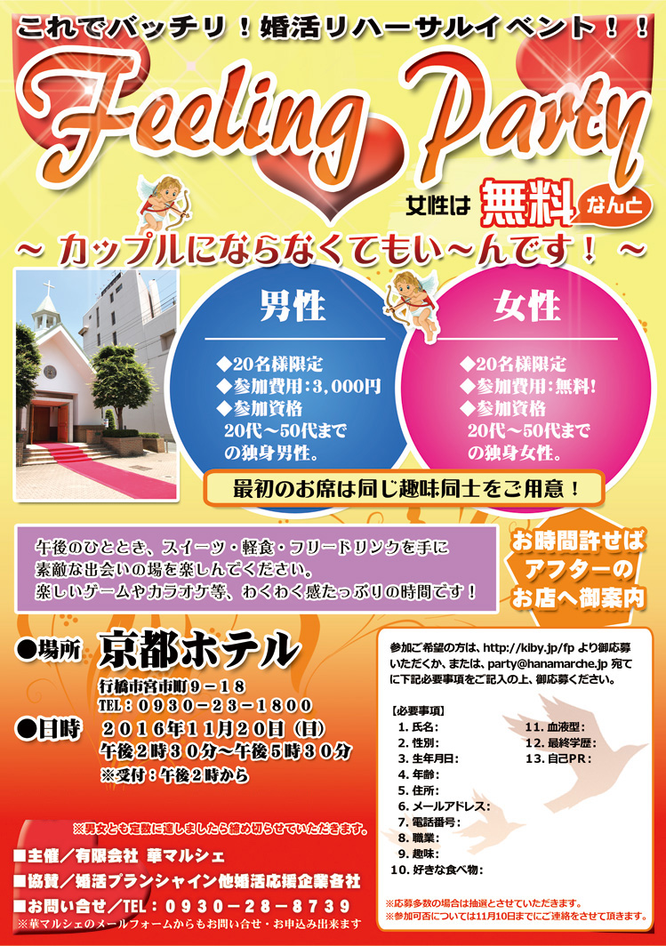 2016年11月20日(日)、行橋市の京都ホテルにて、華マルシェ主催のカップリングパーティー、「Feeling Party 〜 カップルにならなくてもい〜んです! 〜」が開催されます!