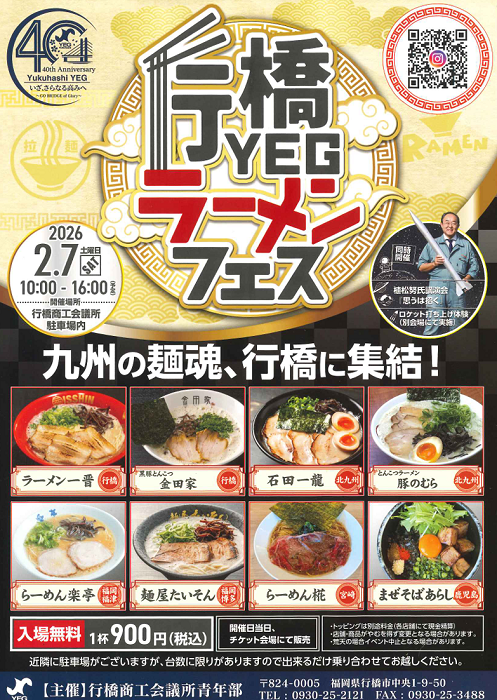 TOP イベント情報 「行橋YEGラーメンフェス!!」開催決定! EVENT イベント情報 2025.12.29(月) 「行橋YEGラーメンフェス!!」開催決定! スポンサーリンク 2026年2月7日(土) 行橋商工会議所駐車場内にて、 「行橋YEGラーメンフェス」開催〜!! 🍜 九州の麵魂、行橋に集結ってことで、 ラーメン好きには こたえられない、わくわくイベント❤。 入場無料 🍜1杯900円。 詳しくは、下記を見るべし!!😊👍 一覧へ戻る 次の記事へ