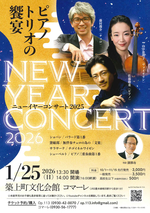 TOP TOPICS ピアノトリオの響宴「ニューイヤーコンサート2026」 TOPICS 今話題になっていること 2025.10.10 ピアノトリオの響宴「ニューイヤーコンサート2026」 築上町 趣味・娯楽 2026年の幕開けは、 築上町文化会館「コマーレ」の ニューイヤーコンサート2026から・・・ チケットのお求めは、 文化会館コマーレまで 0930-56-1777 URL:http://www.comare.org/ 前の記事へ 一覧へ戻る 次の記事へ