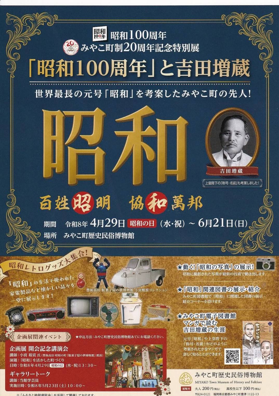 TOP TOPICS 「昭和100周年」と吉田増蔵〜昭和はみやこ町から始まった!?〜 TOPICS 今話題になっていること 2026.3.4 「昭和100周年」と吉田増蔵〜昭和はみやこ町から始まった!?〜 みやこ町 まなぶ スポンサーリンク 京築エリアの情報を ご紹介しています。 前の記事へ 一覧へ戻る 次の記事へ
